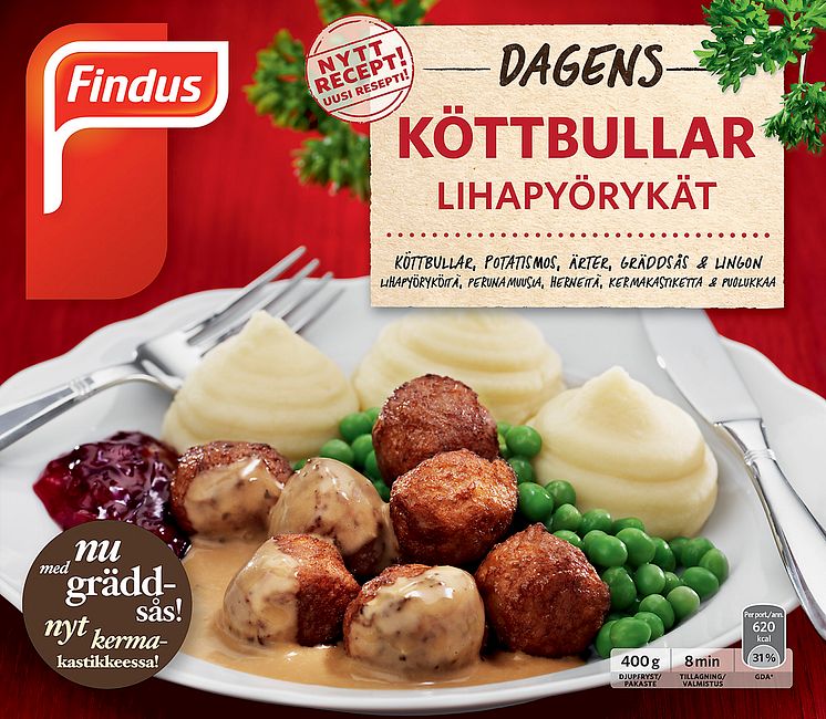 Lihapyöryköitä, perunamuusia, herneitä, kermakastiketta & puolukkaa.