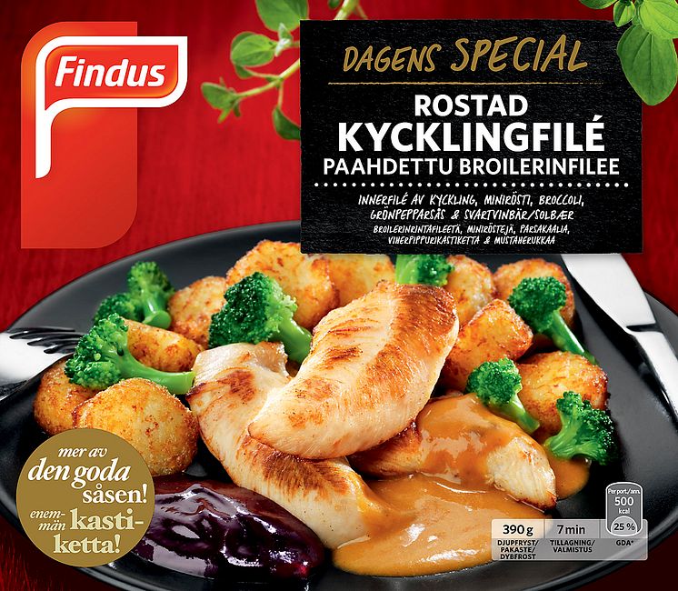 Paahdettu Broilerinfilee -mikroateria sisältää broilerinrintafileetä, viherpippurikastiketta, miniröstejä, parsakaalia ja mustaherukkaa.