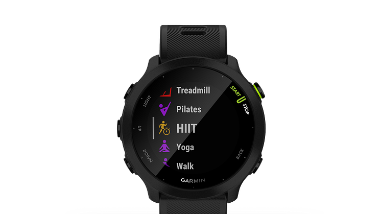 - Vaihtelua harjoittelurutiineihin saa Forerunner 55-älykellon urheilusovelluksilla, lajeina mm. rata- ja virtuaalijuoksu, allasuinti, pilates, HIIT-harjoitukset, jne.
