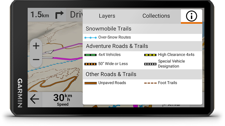 - Maastokartat: Käännös käännökseltä navigointi päällystämättömiä teitä ja polkuja pitkin OpenStreetMap -sisällön avulla. Esiladatut 3D-maastokartat Euroopan, Lähi-Idän ja Afrikan alueilta, mukaan lukien Tracks4Africa. Lisänä moottorikelkoille sopivat reitit Suomessa, Norjassa ja Ruotsissa.