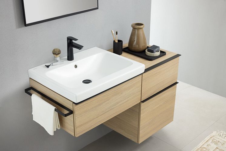 Geberit iCon-allas mattavalkoisena ja Option Square -peili mustilla kehyksillä