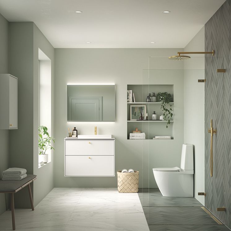 IDO Sense Art -allaskaluste ja -allas ja Geberit Option Square Plus -peili. IDO Glow Art TurboFlush -istuin