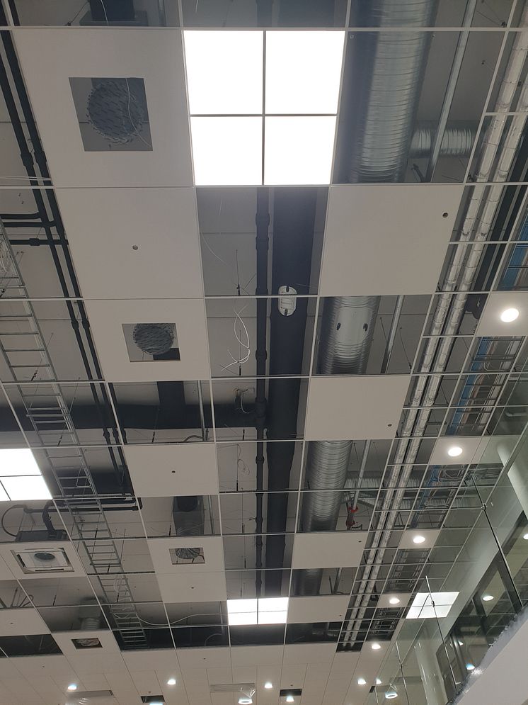 Pluvia-kattokaivojen vaakasuoraan asennetut putket Mirkan tehtaan sisäkatossa, Pietarsaari