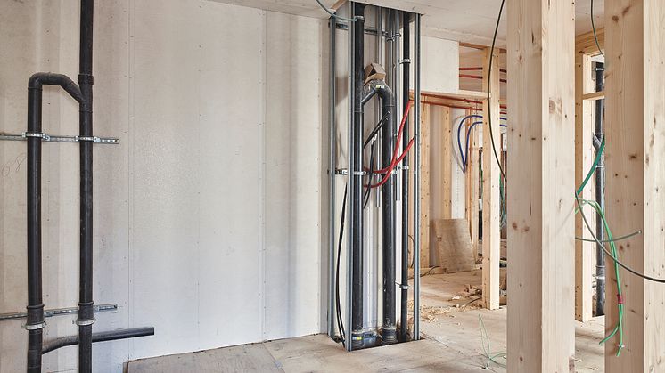 Uusi Geberit Silent-db20 Supertube-viemäriputkisto asennettuna rakennuksessa, vaakakuva