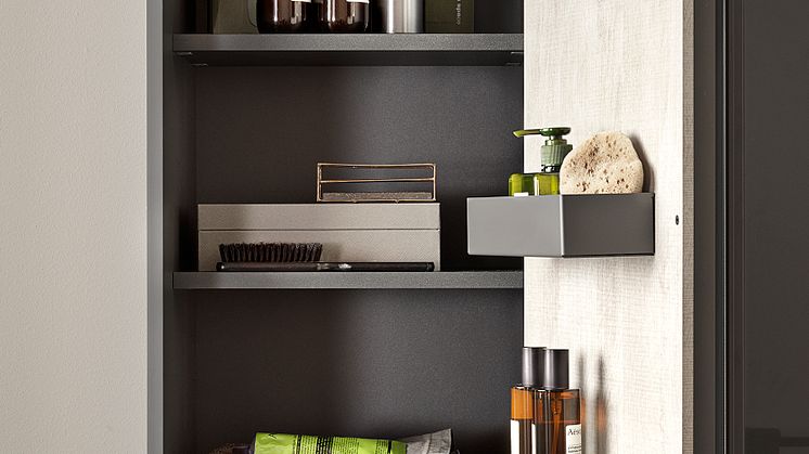 Geberit ONE -peilikaappi upotetaan lähes kokonaan seinän sisään, jolloin ulkonevat peiliovet muistuttavat ilmeeltään kevyttä tasopeiliä. Peilikaapin sisällä on siirrettävät lasihyllyt. Peilin reunus on valmistettu huurretusta lasista, jonka ansiosta ovia voi avata ja sulkea ilman, että sormenjäljet sotkevat peilipinnan. Kaapissa on integroituna suora ja epäsuora valaistus.