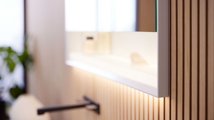 Käytännöllinen Geberit-peilikaappi kerää katseet kylpyhuoneessa. Se paitsi valaisee pesupaikan ja kylpyhuoneen myös tuo runsaasti kätevää säilytystilaa käden ulottuville.