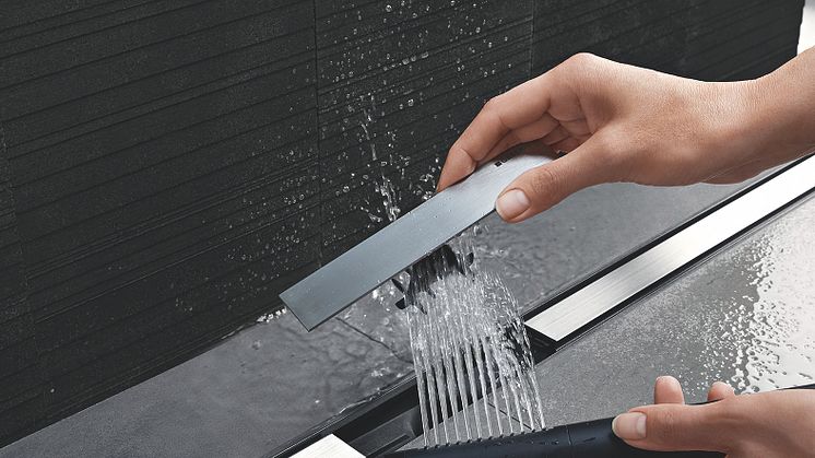 Kuvateksti: Geberit Cleanline -suihkukourun sävyn voi valita sopimaan tyylikkäästi kylpyhuoneen ilmeeseen. Myös kourun pituuden voi itse päättää kohteeseen sopivaksi.