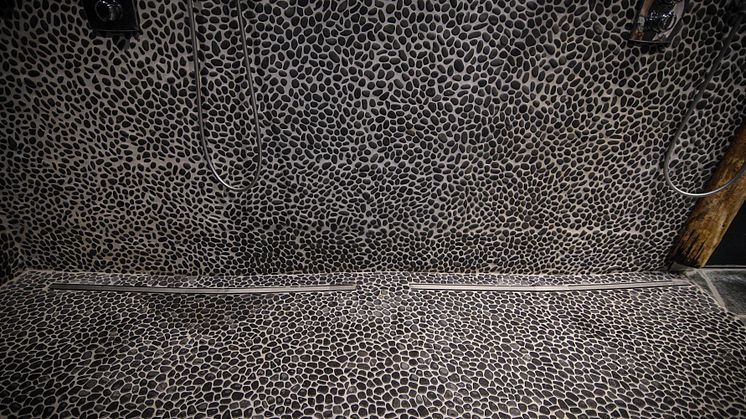 Kuvateksti: Järvikylpylän lattiapinnat vaativat huolellista suunnittelua. Cleanline-suihkukourut oli helppo asentaa lähelle suihkuseinää.