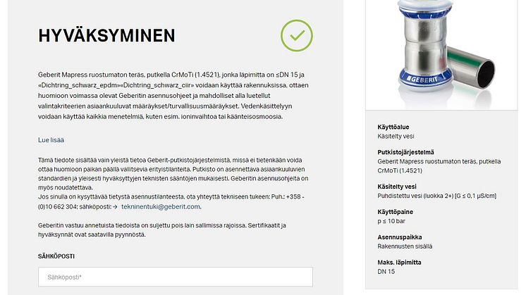 Geberit on kehittänyt nopean ja vaivattoman tuen tarjoamiseksi verkkosovelluksen, jonka avulla LV-suunnittelijat ja asentajat voivat tarkistaa helposti ja luotettavasti mikä putkistomateriaali soveltuu millekin kuljetettavalle aineelle. Teollisen käytön työkalu auttaa valitsemaan juuri oikean syöttöputkistojärjestelmän kuhunkin käyttötarkoitukseen. Kun sovellukseen syöttää kuljetettavan aineen tiedot ja käyttöparametrit, saa välittömästi vastauksen soveltuvasta putkistojärjestelmästä ja tarvittaessa todistuksen soveltuvuudesta myös sähköpostitse. Jos verkkotyökalu ei voi taata yhteensopivuutta, tarjoaa se mahdollisuuden kokeilla toisenlaisia putkistojärjestelmiä tai lähettää tiedustelun Geberitin teknisille asiantuntijoille.