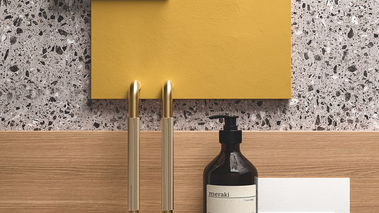 Kaunis tammensävy ja lämmin keltainen; yhdistelmä joka vie ajatukset menneille vuosikymmenille, mutta tuntuu silti tuoreelta ja raikkaalta. Kauniin kokonaisuuden viimeistelevät kullanväriset yksityiskohdat, jotka tuovat kylpyhuoneeseen myös ripauksen arjen luksusta.