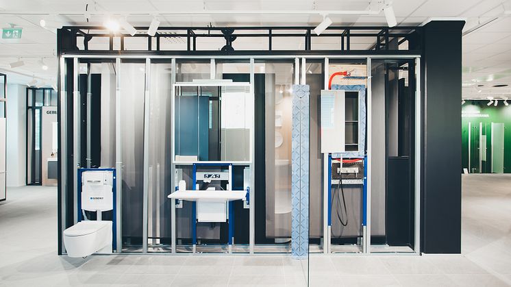 IDO & Geberit Showroomin Geberit-hydrauliikkatornin voi nähdä näyttelytilasta tai siihen voi sovitusti tutustua kerros kerrokselta yhdessä asiantuntijan kanssa. Tornin katonrajassa on myös Geberitin kattovedenpoistojärjestelmä Pluvia.