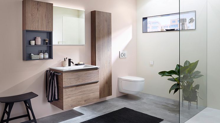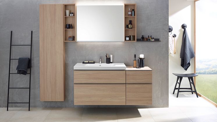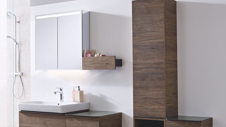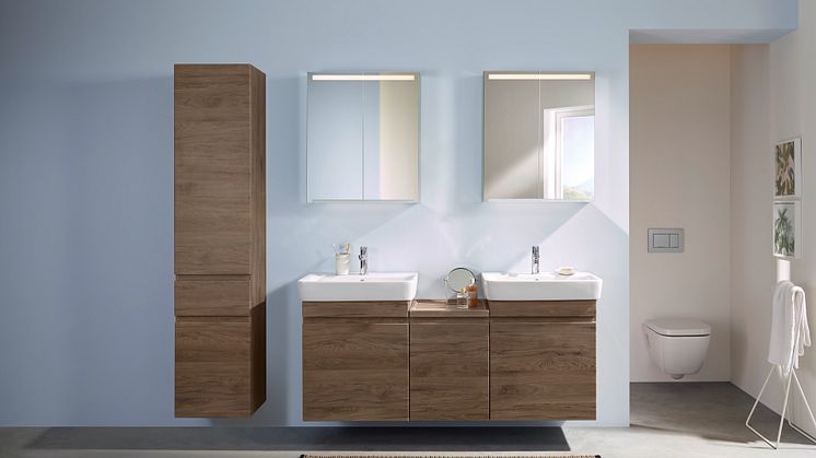 Geberit Smyle -sarjan pesuallas sekä sivu- ja keskikorkeat kaapit ovat niin ikään saatavilla puun sävyissä.