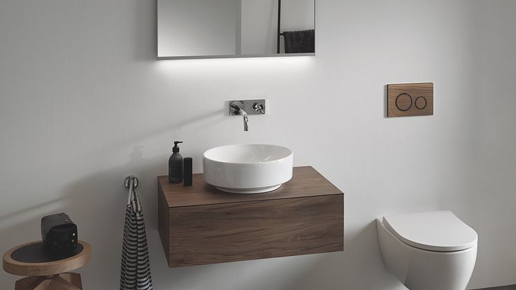 “Esimerkiksi Geberitin huuhtelupainikkeet Sigma21 ja Sigma50 ovat saatavilla puupinnalla. Ne ovat katseenvangitsijoita, jotka viimeistelevät kylpyhuoneen tyylin”, Närevuori toteaa.