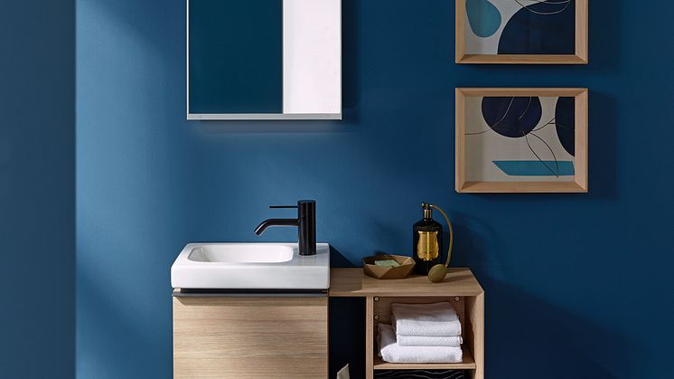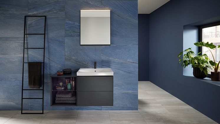 Geberitin vuoden 2024 kylpyhuonetrendeissä tummat värit korvaavat perinteisen kokovalkoisen.
