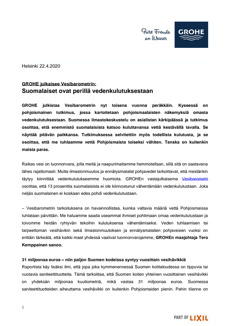 GROHE julkistaa Vesibarometrin nyt toisena vuonna peräkkäin.Kyseessä on pohjoismainen tutkimus, jossa kartoitetaan pohjoismaalaisten näkemyksiä omasta vedenkulutuksestaan.Suomessa ilmastokeskustelu on asialistan kärkipäässä ja tutkimus osoittaa, että enemmistö suomalaisista katsoo kuluttavansa vettä kestävällä tavalla.