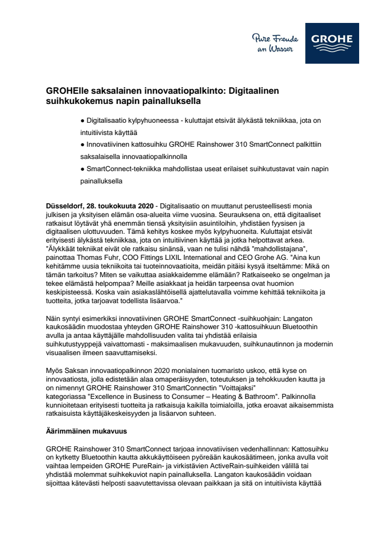 ● Innovatiivinen kattosuihku GROHE Rainshower 310 SmartConnect palkittiin saksalaisella innovaatiopalkinnolla