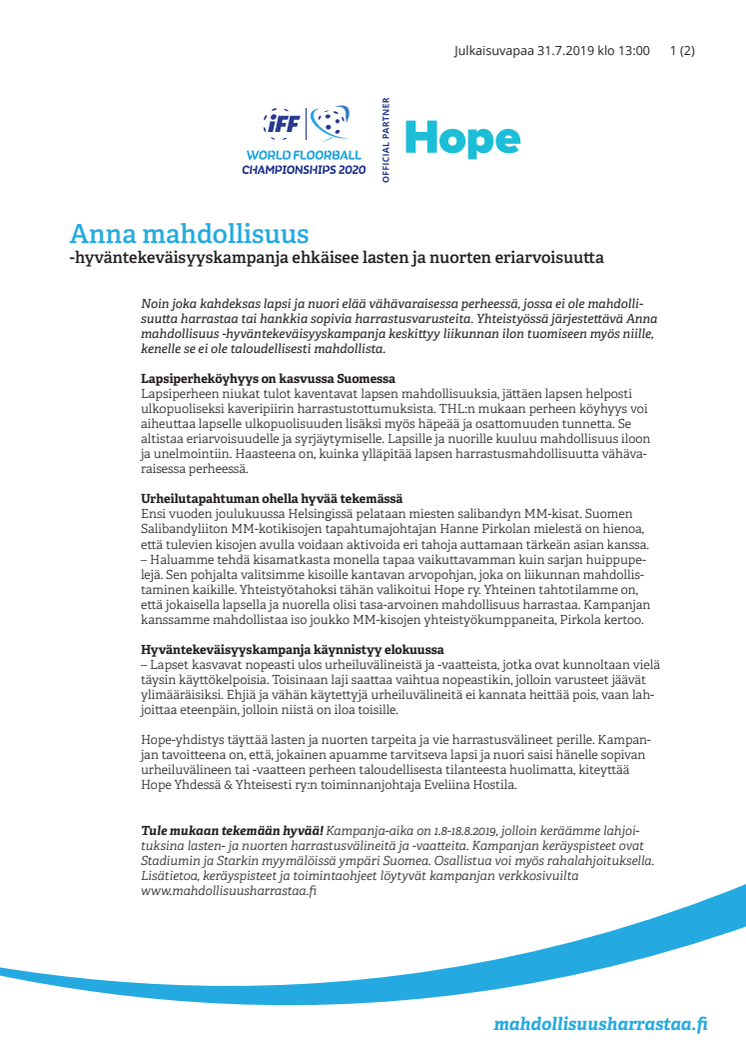 Noin joka kahdeksas lapsi ja nuori elää vähävaraisessa perheessä, jossa ei ole mahdollisuutta harrastaa tai hankkia sopivia harrastusvarusteita. Yhteistyössä järjestettävä Anna
