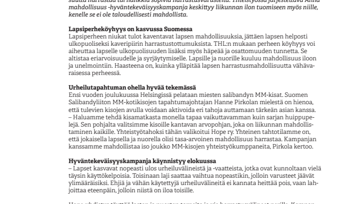 Ensi vuoden joulukuussa Helsingissä pelataan miesten salibandyn MM-kisat. Suomen Salibandyliiton MM-kotikisojen tapahtumajohtajan Hanne Pirkolan mielestä on hienoa, että tulevien kisojen avulla voidaan aktivoida eri tahoja auttamaan tärkeän asian kanssa. – Haluamme tehdä kisamatkasta monella tapaa vaikuttavamman kuin sarjan huippupelejä. Sen pohjalta valitsimme kisoille kantavan arvopohjan, joka on liikunnan mahdollistaminen kaikille. Yhteistyötahoksi tähän valikoitui Hope ry. Yhteinen tahtotilamme on, että jokaisella lapsella ja nuorella olisi tasa-arvoinen mahdollisuus harrastaa. Kampanjan kanssamme mahdollistaa iso joukko MM-kisojen yhteistyökumppaneita, Pirkola kertoo.