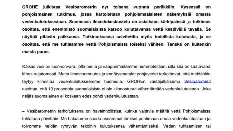 GROHE julkistaa Vesibarometrin nyt toisena vuonna peräkkäin.Kyseessä on pohjoismainen tutkimus, jossa kartoitetaan pohjoismaalaisten näkemyksiä omasta vedenkulutuksestaan.Suomessa ilmastokeskustelu on asialistan kärkipäässä ja tutkimus osoittaa, että enemmistö suomalaisista katsoo kuluttavansa vettä kestävällä tavalla.Se näyttää pitävän paikkansa.Tutkimuksessa selvitettiin myös todellista kulutusta, ja se osoittaa, että me tuhlaamme vettä Pohjoismaista toiseksi vähiten.Tanska on kuitenkin maista paras.