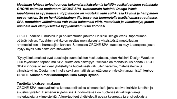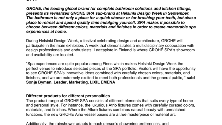 "Spa experiences are quite popular among Finns which makes Helsinki Design Week the perfect venue to introduce selected pieces of the SPA portfolio. Visitors will have the opportunity to see GROHE SPA's innovative ideas combined with carefully chosen colors, materials, and finishes, and we are extremely excited to meet both professionals and the general public, “ said Sonja Byman, Leader, Marketing, LIXIL EMENA