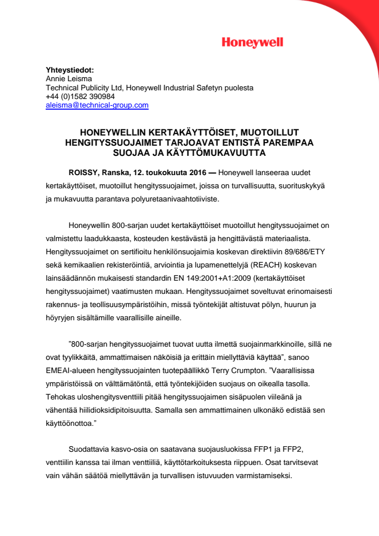 Honeywell lanseeraa uudet kertakäyttöiset, muotoillut hengityssuojaimet, joissa on turvallisuutta, suorituskykyä ja mukavuutta parantava polyuretaanivaahtotiiviste.
