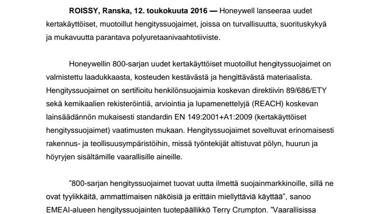 ROISSY, Ranska, 12. toukokuuta 2016 — Honeywell lanseeraa uudet kertakäyttöiset, muotoillut hengityssuojaimet, joissa on turvallisuutta, suorituskykyä ja mukavuutta parantava polyuretaanivaahtotiiviste.