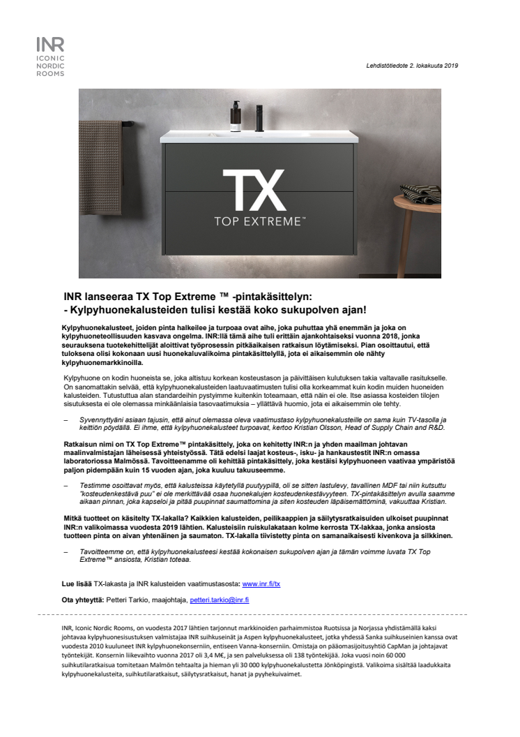 INR lanseeraa TX Top Extreme ™ -pintakäsittelyn: Kylpyhuonekalusteiden tulisi kestää koko sukupolven ajan!