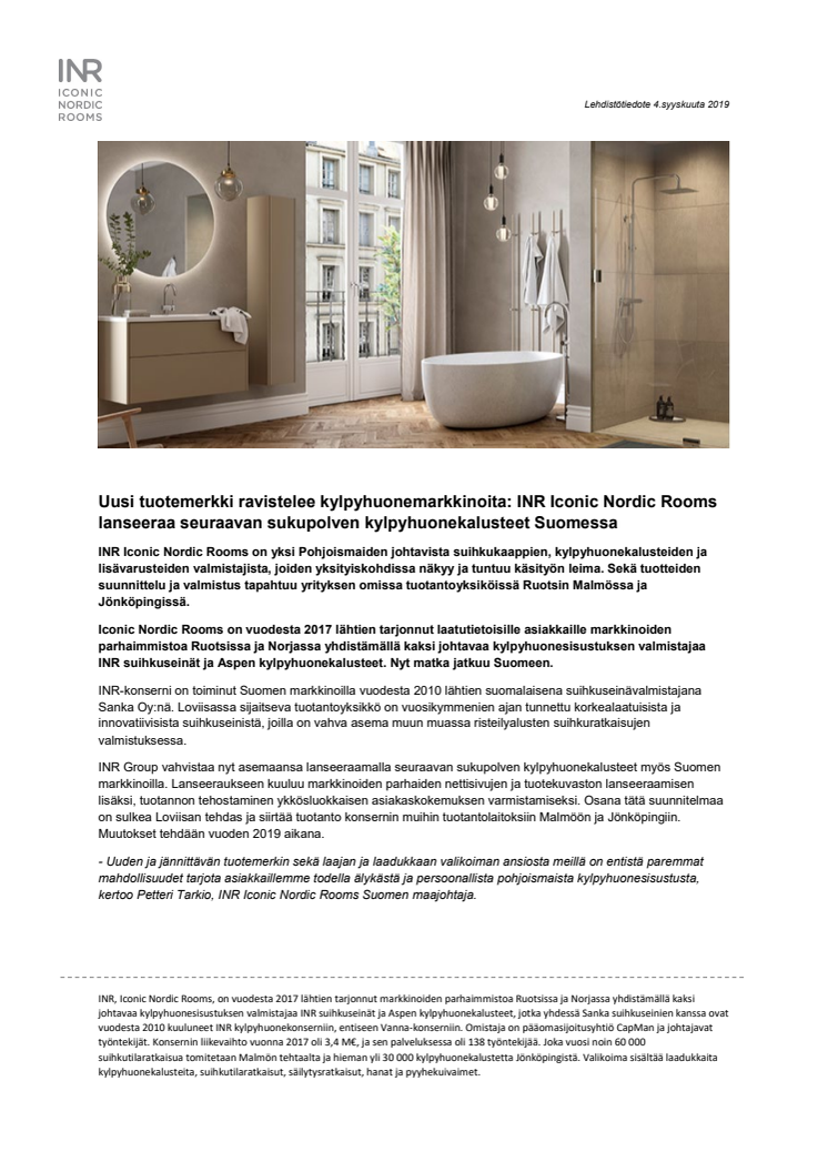 Uusi tuotemerkki ravistelee kylpyhuonemarkkinoita: INR Iconic Nordic Rooms lanseeraa seuraavan sukupolven kylpyhuonekalusteet Suomessa