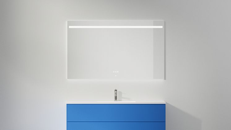 Pystysuuntainen Line-pyyhekuivain hohtaa turkoosinsinisenä päälle kytkettynä. NCS S 0585-Y70R.