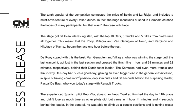 The tenth special of the competition connected the cities of Belén and La Rioja, and included a must-have feature of every Dakar: dunes. In fact, the huge mountains of sand in Fiambalá crushed the hopes of many participants, but that wasn't the case with Iveco.