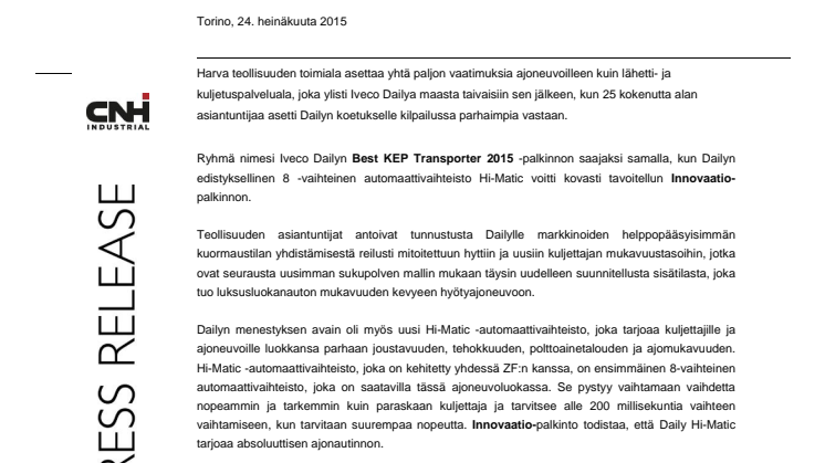 Ryhmä nimesi Iveco Dailyn Best KEP Transporter 2015 -palkinnon saajaksi samalla, kun Dailyn edistyksellinen 8 -vaihteinen automaattivaihteisto Hi-Matic voitti kovasti tavoitellun Innovaatio-palkinnon.