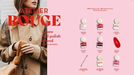 Muotimaailmasta ja katutyylistä inspiraatiota ammentanut, täysin uusi Atelier Rouge -kynsituotemerkki haluaa korostaa kynsiä tyylin viimeistelevinä asusteina. Atelier Rouge -kynsilakoissa yhdistyvät pariisilaiset ja skandinaaviset trendivärit, joista on helppo rakentaa oma kynsilakkakokoelma. Kynsilakkojen lisäksi tuotevalikoimaan kuuluu kynsien hoitotuotteita sekä kynsivälineitä.