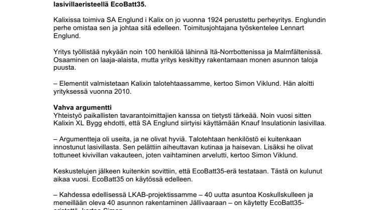 Vuoden kestäneen hyvän kokemuksen jälkeen rakennusyhtiö SA Englund Kalixissa on päättänyt jatkaa Knauf Insulationin EcoBatt35: lla. Koskullskullessa ja Gällivareessa yhteensä 80 uutta asuntoa eristetään Knauf Insulationin lasivillaeristeellä EcoBatt35.
