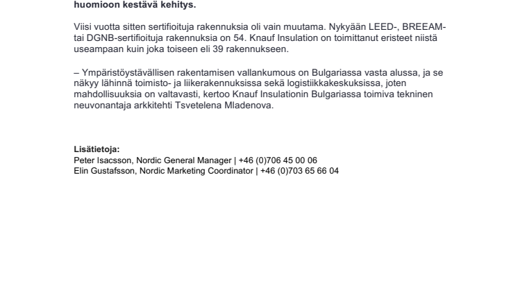 Bulgariassa ei vielä ole kovin useita ympäristöystävällisiksi sertifioituja rakennuksia, mutta Knauf Insulation on suuri merkitys, kun rakentamisessa otetaan huomioon kestävä kehitys.
