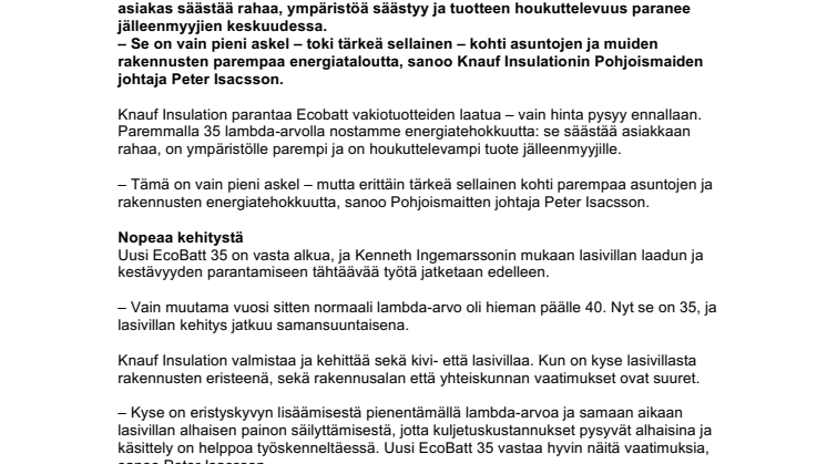 Knauf Insulation parantaa perustuotteensa EcoBattin laatua – mutta hinta pysyy ennallaan. Lambda-arvon pienentäminen 35:een parantaa energiatehokkuutta: asiakas säästää rahaa, ympäristöä säästyy ja tuotteen houkuttelevuus paranee jälleenmyyjien keskuudessa.