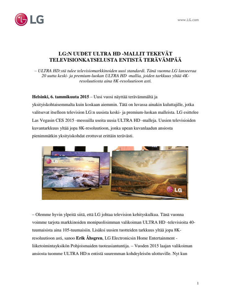 – ULTRA HD:stä tulee televisiomarkkinoiden uusi standardi. Tänä vuonna LG lanseeraa 20 uutta keski- ja premium-luokan ULTRA HD -mallia, joiden tarkkuus yltää 4K-resoluutiosta aina 8K-resoluutioon asti.