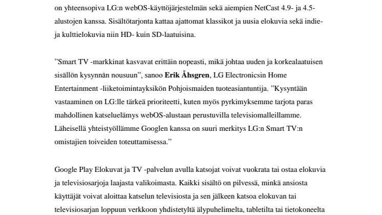 ”Smart TV -markkinat kasvavat erittäin nopeasti, mikä johtaa uuden ja korkealaatuisen sisällön kysynnän nousuun”, sanoo Erik Åhsgren, LG Electronicsin Home Entertainment -liiketoimintayksikön Pohjoismaiden tuoteasiantuntija. ”Kysyntään vastaaminen on LG:lle tärkeä prioriteetti, kuten myös pyrkimyksemme tarjota paras mahdollinen katseluelämys webOS-alustaan perustuvilla televisiomalleillamme. Läheisellä yhteistyöllämme Googlen kanssa on suuri merkitys LG:n Smart TV:n omistajien toiveiden toteuttamisessa.”