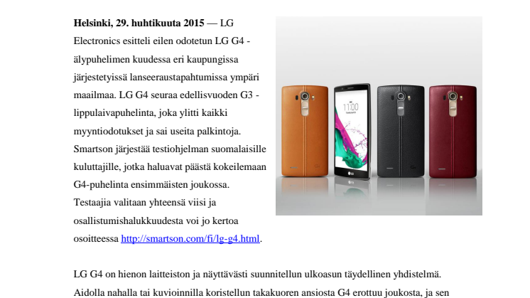 Helsinki, 29. huhtikuuta 2015 — LG Electronics esitteli eilen odotetun LG G4 -älypuhelimen kuudessa eri kaupungissa järjestetyissä lanseeraustapahtumissa ympäri maailmaa. LG G4 seuraa edellisvuoden G3 -lippulaivapuhelinta, joka ylitti kaikki myyntiodotukset ja sai useita palkintoja. Smartson järjestää testiohjelman suomalaisille kuluttajille, jotka haluavat päästä kokeilemaan G4-puhelinta ensimmäisten joukossa. Testaajia valitaan yhteensä viisi ja osallistumishalukkuudesta voi jo kertoa osoitteessa http://smartson.com/fi/lg-g4.html.