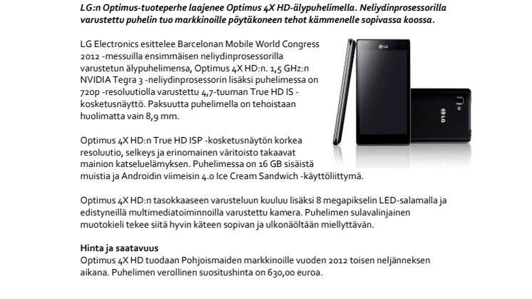 LG Electronics esittelee Barcelonan Mobile World Congress 2012 -messuilla ensimmäisen neliydinprosessorilla varustetun älypuhelimensa, Optimus 4X HD:n. 1,5 GHz:n NVIDIA Tegra 3 -neliydinprosessorin lisäksi puhelimessa on 720p -resoluutiolla varustettu 4,7-tuuman True HD IS -kosketusnäyttö. Paksuutta puhelimella on tehoistaan huolimatta vain 8,9 mm.