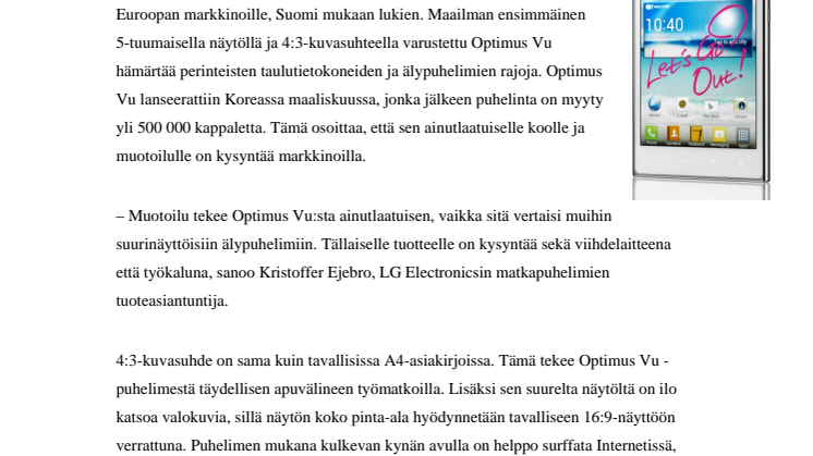 Helsinki, 27. elokuuta, 2012 – Optimus Vu lanseerattiin onnistuneesti Koreassa ja Japanissa. Nyt puhelin saadaan valikoiduille Euroopan markkinoille, Suomi mukaan lukien. Maailman ensimmäinen