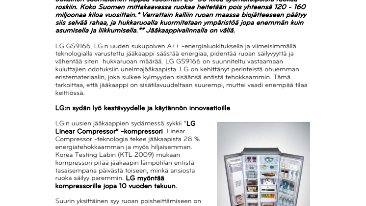 LG:n uusien jääkaappien sydämessä sykkii ”LG Linear Compressor” -kompressori. Linear Compressor -teknologia tekee jääkaapista 28 % energiatehokkaamman ja myös hiljaisemman. Korea Testing Labin (KTL 2009) mukaan kompressori pitää jääkaapin lämpötilan entistä tasaisempana päivästä toiseen, minkä ansiosta ruoka säilyy paremmin. LG myöntää kompressorille jopa 10 vuoden takuun.