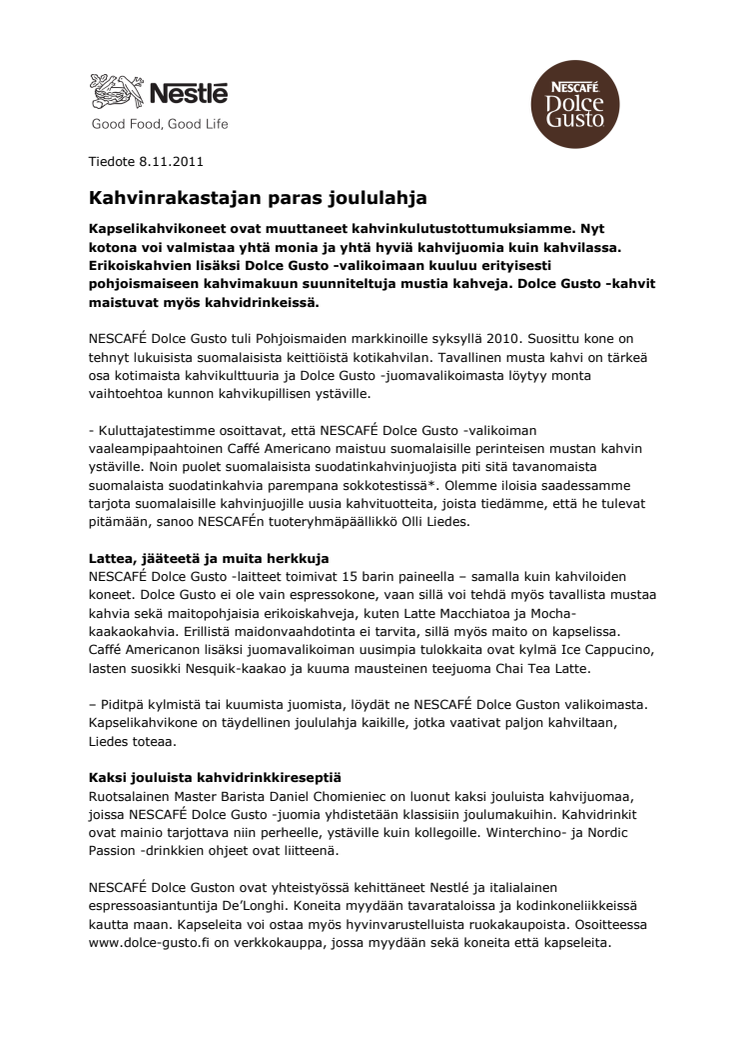 Kapselikahvikoneet ovat muuttaneet kahvinkulutustottumuksiamme. Nyt kotona voi valmistaa yhtä monia ja yhtä hyviä kahvijuomia kuin kahvilassa. Erikoiskahvien lisäksi Dolce Gusto -valikoimaan kuuluu erityisesti pohjoismaiseen kahvimakuun suunniteltuja mustia kahveja. Dolce Gusto -kahvit maistuvat myös kahvidrinkeissä.