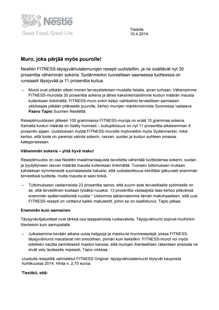 Nestlén FITNESS-täysjyvähiutalemurojen resepti uudistettiin, ja ne sisältävät nyt 30 prosenttia vähemmän sokeria. Sydänmerkin tuoreeltaan saaneessa tuotteessa on runsaasti täysjyvää ja 11 prosenttia kuitua.