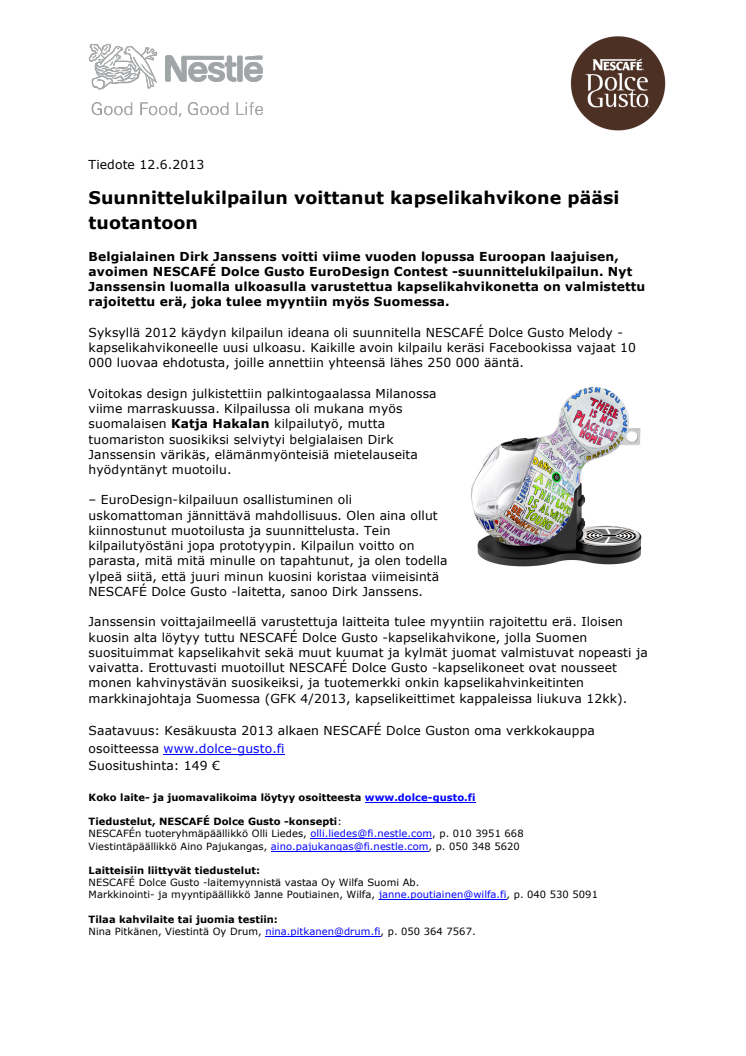 Belgialainen Dirk Janssens voitti viime vuoden lopussa Euroopan laajuisen, avoimen NESCAFÉ Dolce Gusto EuroDesign Contest -suunnittelukilpailun. Nyt Janssensin luomalla ulkoasulla varustettua kapselikahvikonetta on valmistettu rajoitettu erä, joka tulee myyntiin myös Suomessa.