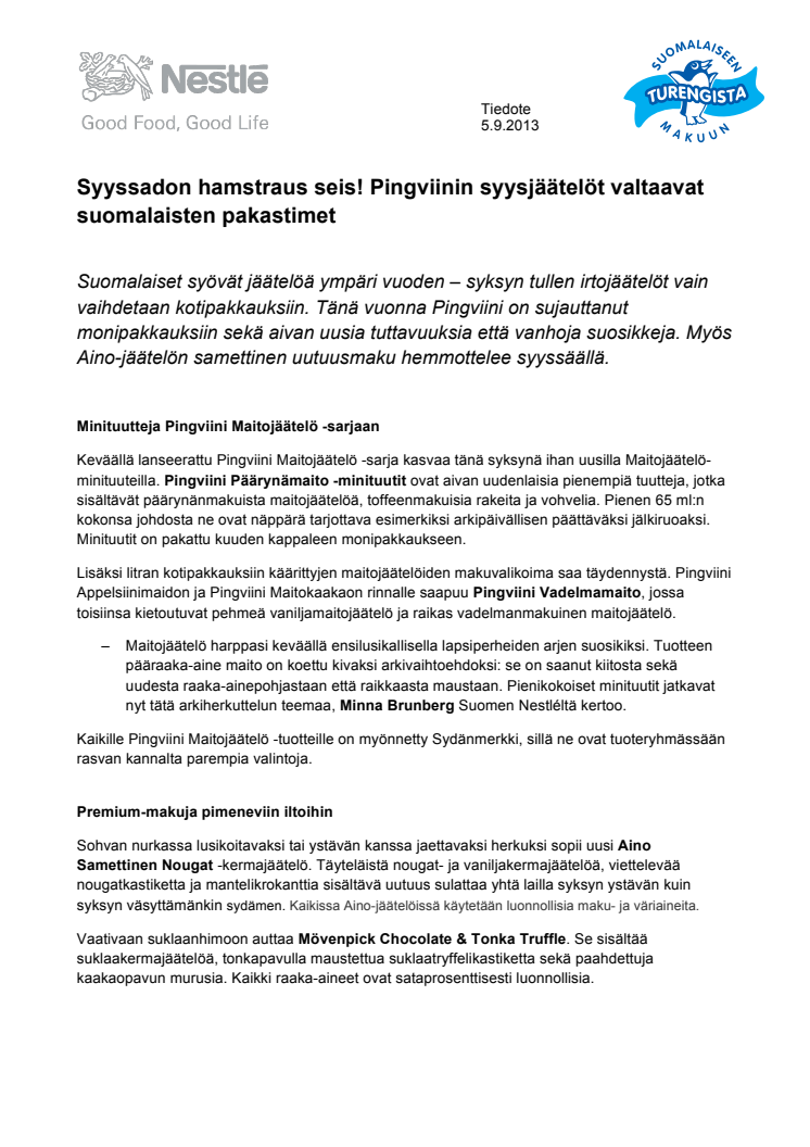 Pingviinin syksyn 2013 jäätelöuutuuksiin kuuluu monia monipakkauksia: Pingviini Päärynämaito -minituutit, Angry Birds -tuutit, Fazer Geisha -tuutit sekä vähälaktoosinen Puffet Banaani. Arkiherkutteluun on tarjolla maitojäätelösarjan tulokas Pingviini Vadelmamaito, ja syysiltojen hemmotteluhetkiin sopivat Aino-jäätelön uusi Samettinen Nougat sekä Mövenpickin ylellinen Chocolate & Tonka Truffle.