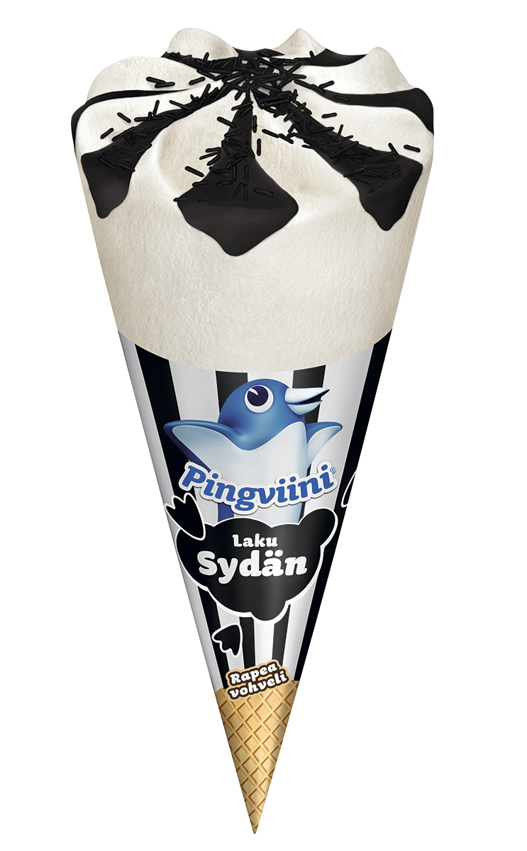 Pingviini Lakusydän: Vaniljakermajäätelöä, lakritsikastiketta ja lakritsisydän, 1,9 dl / 106 g.
