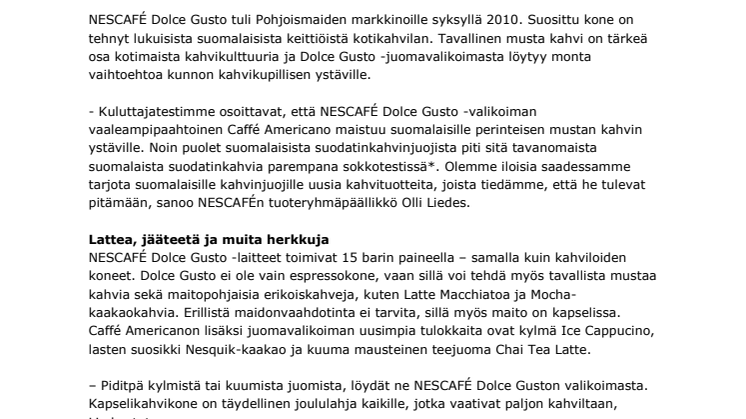 - Kuluttajatestimme osoittavat, että NESCAFÉ Dolce Gusto -valikoiman vaaleampipaahtoinen Caffé Americano maistuu suomalaisille perinteisen mustan kahvin ystäville. Noin puolet suomalaisista suodatinkahvinjuojista piti sitä tavanomaista suomalaista suodatinkahvia parempana sokkotestissä*. Olemme iloisia saadessamme tarjota suomalaisille kahvinjuojille uusia kahvituotteita, joista tiedämme, että he tulevat pitämään, sanoo NESCAFÉn tuoteryhmäpäällikkö Olli Liedes.