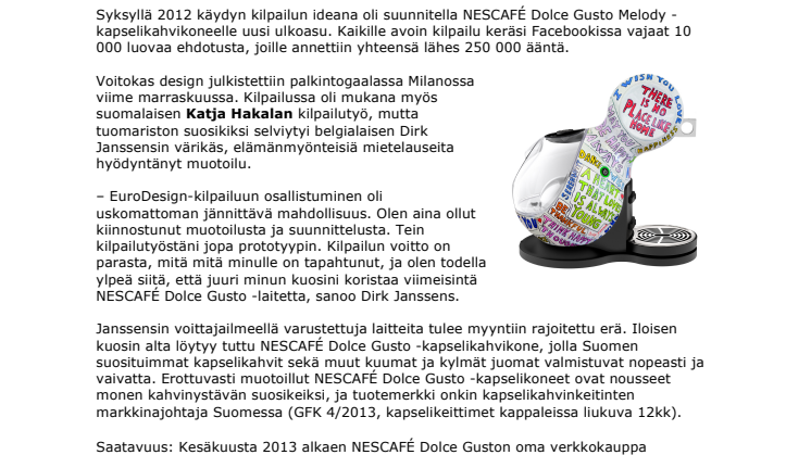 Belgialainen Dirk Janssens voitti viime vuoden lopussa Euroopan laajuisen, avoimen NESCAFÉ Dolce Gusto EuroDesign Contest -suunnittelukilpailun. Nyt Janssensin luomalla ulkoasulla varustettua kapselikahvikonetta on valmistettu rajoitettu erä, joka tulee myyntiin myös Suomessa.