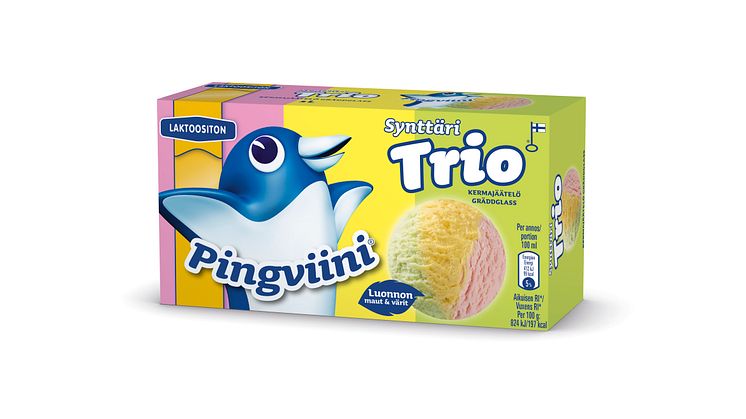 Lasten suosikki, mansikka-, vanilja- ja suklaakermajäätelöä yhdistävä värikäs Pingviini Herkkutrio on ollut jäätelövalikoiman litran kotipakkausten peruskivi jo vuosia. Tänä vuonna se saa kaverikseen täysin laktoosittoman, Pingviini Synttäritrio -kermajäätelön, jossa omina makuraitoinaan kiemurtelevat täyteläiset mansikka-, banaani- ja päärynäkermajäätelö. Uutuusjäätelön maut ja värit tulevat luonnosta.