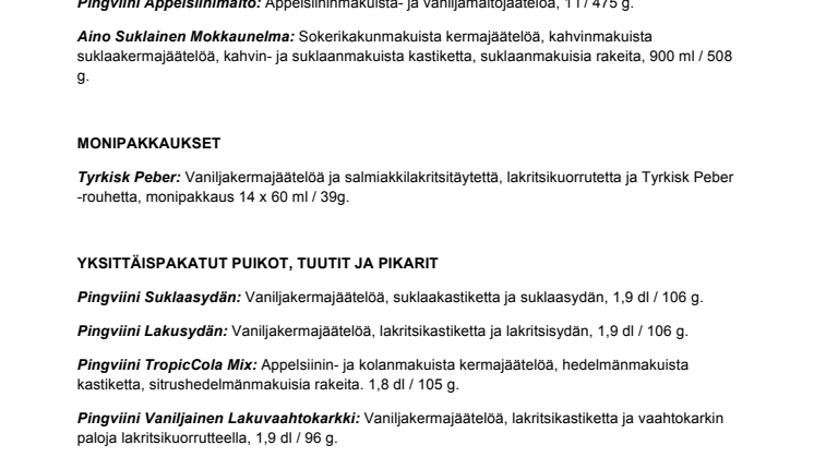 – Tyylejä ja tilanteita jäätelön nauttimiseen on monia aina arkisesta välipalasta ylelliseen hemmotteluun ja juhlahetkiin. Samalla ihmiset suhtautuvat syömiseensä yhä yksilöllisemmin, ja myös raaka-ainepuolella erilaisille vaihtoehdoille tuntuu olevan kysyntää. Me olemme vastanneet kuluttajien toiveisiin esimerkiksi tuomalla kauppoihin Pingviini-maitojäätelön ja kioskeille Mövenpick-jugurttijäätelön, markkinointipäällikkö Minna Brunberg Suomen Nestléltä kommentoi.
